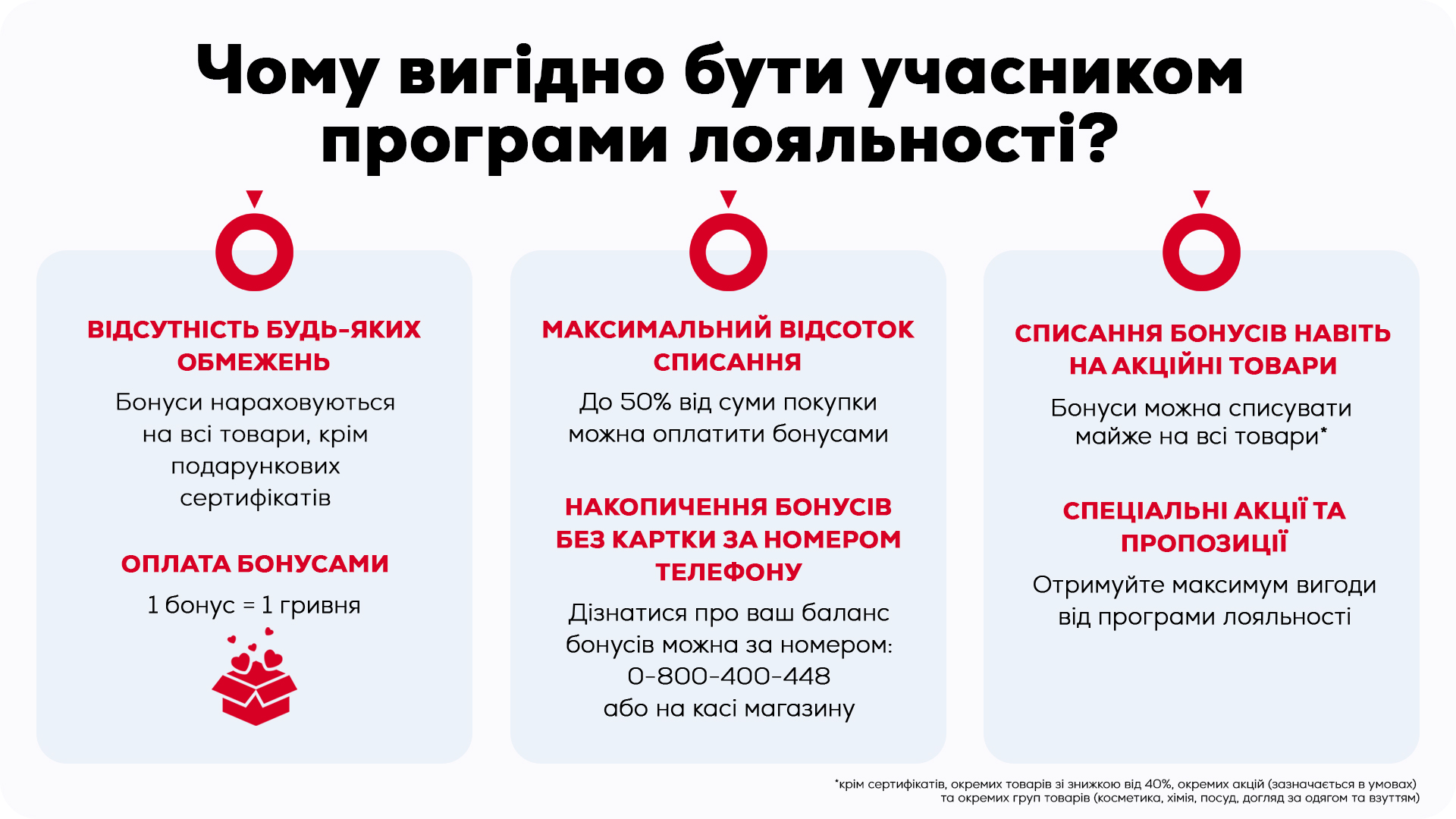 – Окрема група товарів, які вже реалізуються в мережі Організатора за знижкою, можуть мати обмеження на використання в оплаті Бонусів за Програмою. Про такі групи товарів Учасника буде повідомлено окремо в умовах акції.